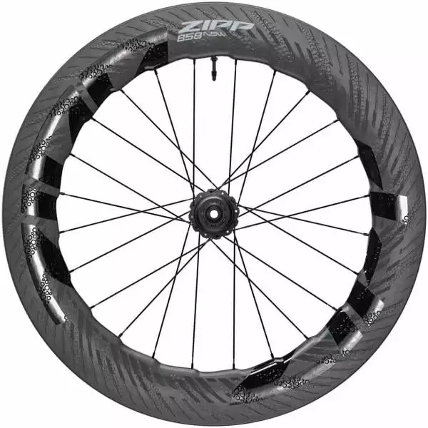 Le résultat est assez surprenant sur cette 858 NSW Disc, qui affiche un profil SawTooth ondulé, en dents de scie, variable en hauteur entre 77 et 82 mm. En surface, la jante présente un revêtement HexFin ABLC, de type balle de golf, avec des motifs hexagonaux légèrement creusés, qui permettent de réduire la traînée aérodynamique et d’améliorer la stabilité en cas de vent latéral.