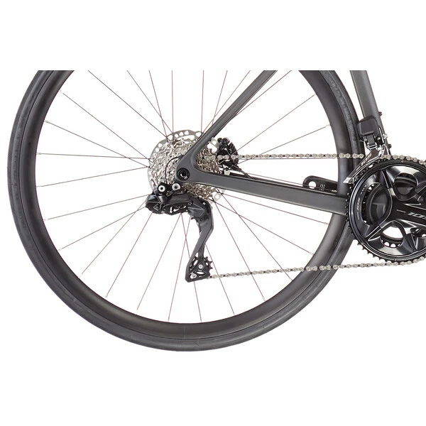 Ce modèle est ici équipé du groupe électronique 105 Di2 de Shimano. Un modèle de fiabilité qui ne demande qu’à avaler les kilomètres. Avec ses développements 2×12 vitesses, monté en 11/34 à l’arrière, il s’adaptera sans problème à tous les profils de sortie.