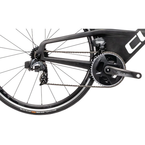 Ce Cube Aerium C:68 est équipé avec le groupe électrique sans fil Sram Force eTap AXS 2×12 vitesses, une paire de roues Fulcrum Racing 44 Aero C17 chaussées de pneus Schwalbe Pro One, et des freins sur jante Magura RT Aero Carbon vous confèrant la puissance dont vous avez besoin pour un contrôle de la vitesse en toute sécurité.